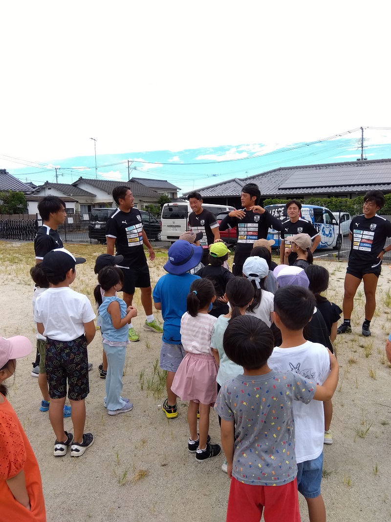 2024年8月19日、大分県中津市のいずみの園かきぜサポートセンターにて、放課後等デイサービスを利用する児童を対象とした「ジェイリースFCサッカー教室&リズムトレーニング教室」を行いました。 ジェイリースFCより、元サッカー日本代表でジェイリースCROの高松大樹さんをはじめ選手・スタッフの皆さまが来場し、参加した子どもたちと楽しくサッカーで交流を行いました。 写真はジェイリースFCサッカー教室の様子です。