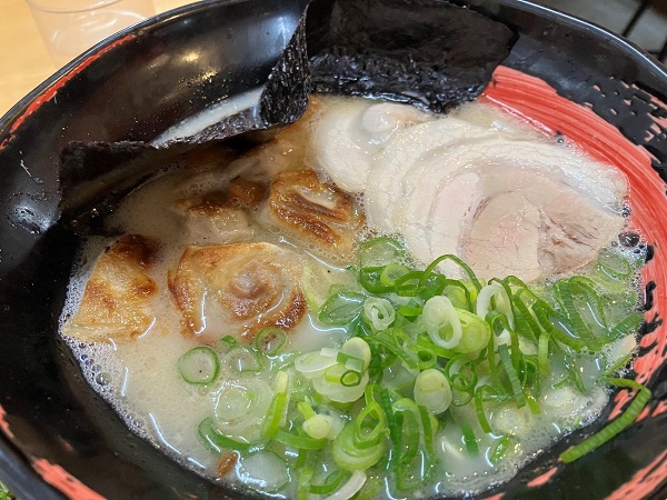 久留米の豚骨ラーメン特有の骨粉が入った、臭みもあるけど濃厚で奥深い味わいのスープに、小麦の香りがする細すぎない麺が絶妙にマッチします。焼きワンタンは表面を焼いているので、カリっとした食感に、豚骨スープがマッチします。