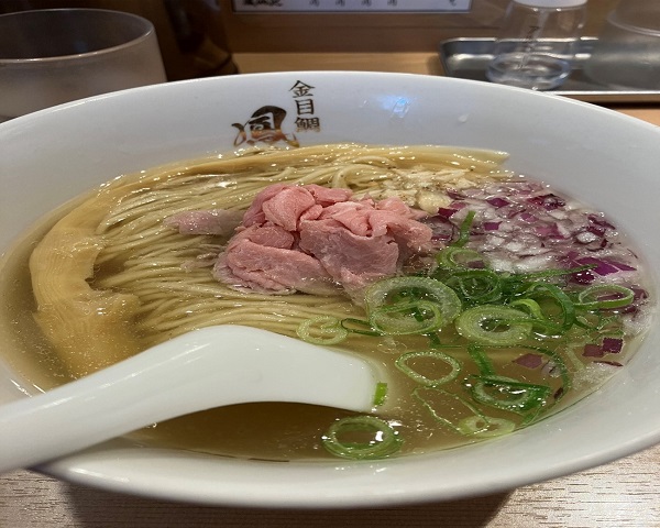 まず、スープは塩味が少なく、ほど良い醤油に、金目鯛のパンチがかなり効いています。「ここまで金目鯛の味がしっかり出ているのか!」と感じてしまうくらい金目鯛です。